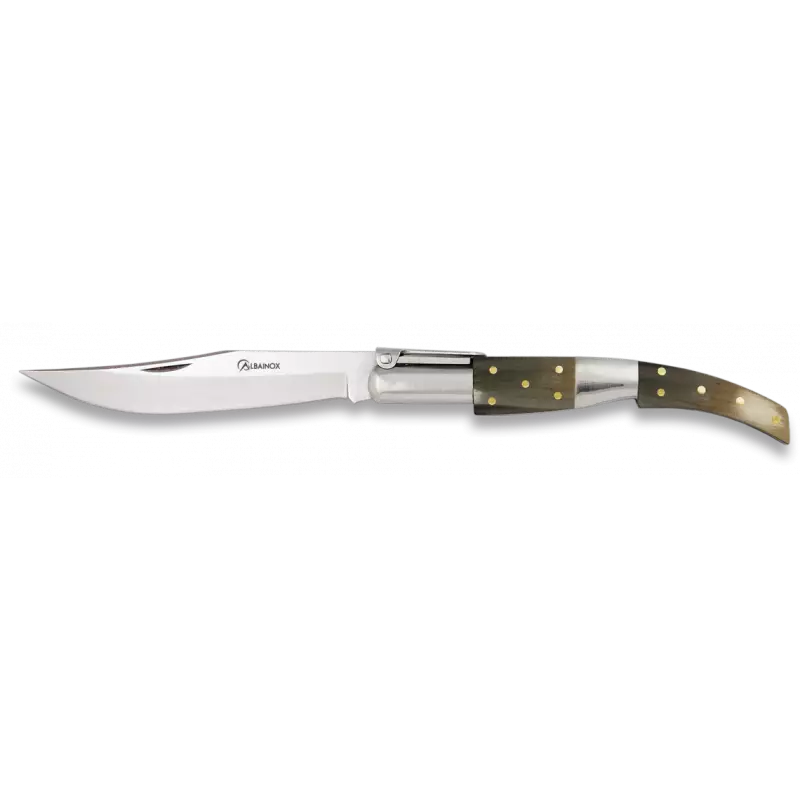 Con una hoja de 12 cm y cachas de auténtica asta de toro, esta navaja destaca por su sistema de carraca, un mecanismo tradicional que permite asegurar la hoja en posiciones intermedias. La virola metálica refuerza el diseño, mientras que el uso de asta de toro aporta un estilo único. Esta navaja es reconocida dentro de la tradición española de cuchillería por su funcionalidad y su diseño distintivo.
