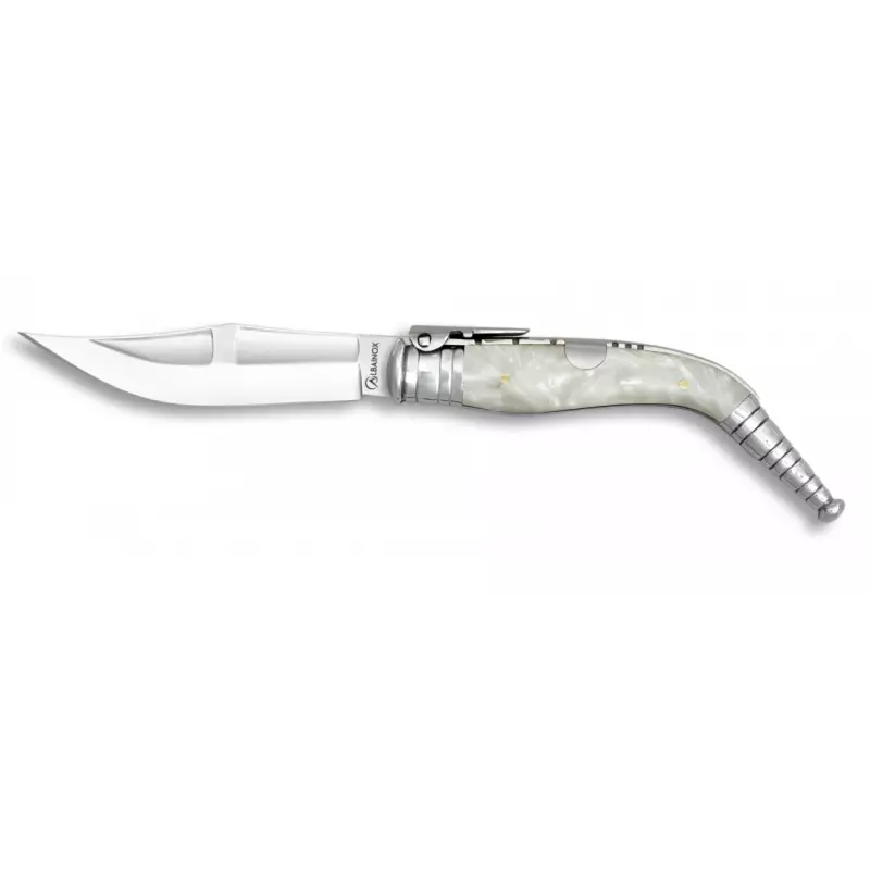 La navaja bandolera de carraca presenta una hoja de 14 cm de acero 3Cr13Mov, reconocida por su resistencia y durabilidad. Las cachas están hechas de imitación nácar, y la virola de aluminio complementa el diseño. Su sistema de carraca permite fijar la hoja en diferentes posiciones. El largo total de la navaja es de 33 cm, lo que proporciona un tamaño adecuado para su uso y transporte.