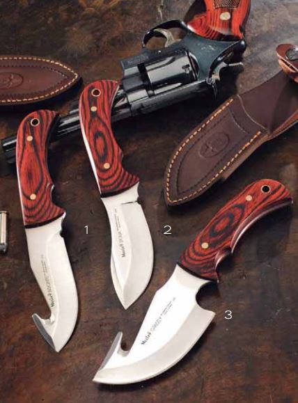 Entre sus distintas hojas abundan los ganchos. Respecto a las cachas, están elaboradas en asta de ciervo, madera de olivo o madera prensada de coral, y otros materiales como el phenolcraft. Los cuchillos desolladores Muela presentan grandes acabados que, en muchos casos, se deben a su elaboración completamente artesana. Entre los nombres más destacados están el modelo Sabueso, el modelo Beagle, el modelo Sioux o el ya clásico Mouse.